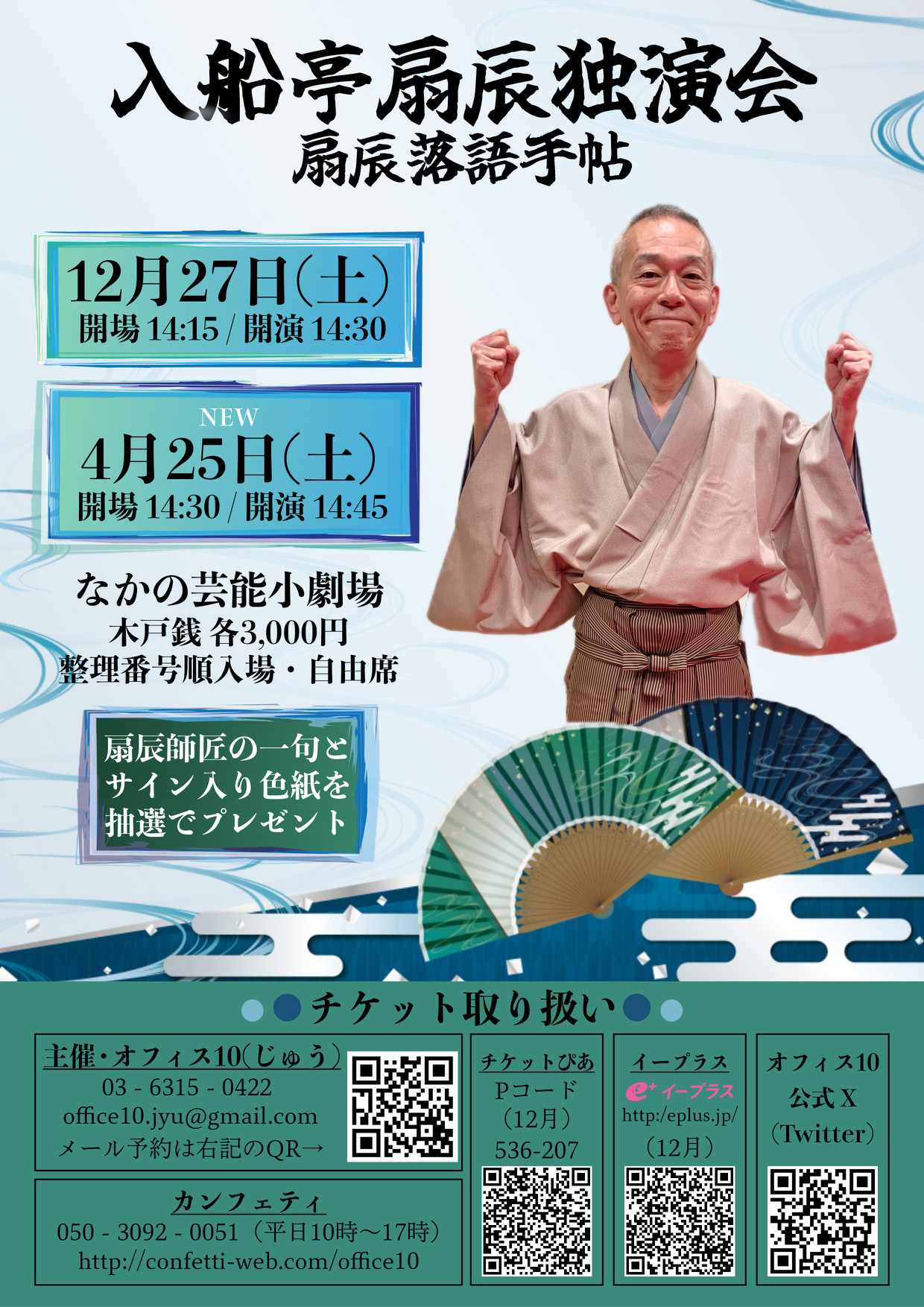 ![]() 扇辰落語手帖 日時:12月27日(土)開演14:30 会場:なかの芸能小劇場 料金:3,000円、整理番号順入場・自由席 出演:入船亭扇辰 問合:オフィス10(じゅう)03-6315-0422 office10.jyu@gmail.com 予約:オフィス10(じゅう) チケットぴあ Pコード:536-207 イープラス オフィス10公式X カンフェティ 050-3092-0051(平日10時~17時) |
