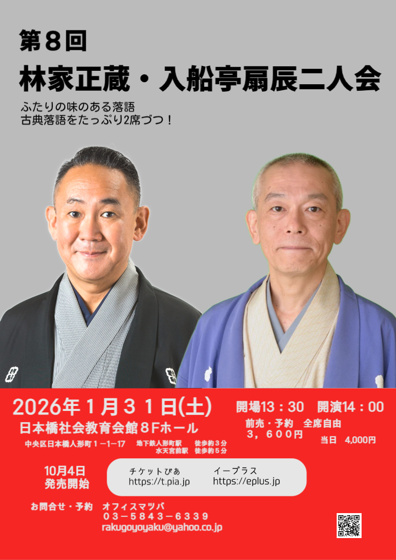 ![]() 第8回 林家正蔵・入船亭扇辰 二人会 日時:2026年1月31日(土)会場13:30、開演14:00 会場:日本橋社会教育会館8Fホール 料金:前売予約3,600円、当日4,000円、全席自由 出演:林家正蔵、入船亭扇辰 問合予約:03ー5843ー6339 オフィスマツバ rakugoyoyaku@yahoo.co.jp 前売:10月4日発売開始、チケットぴあ、イープラス |