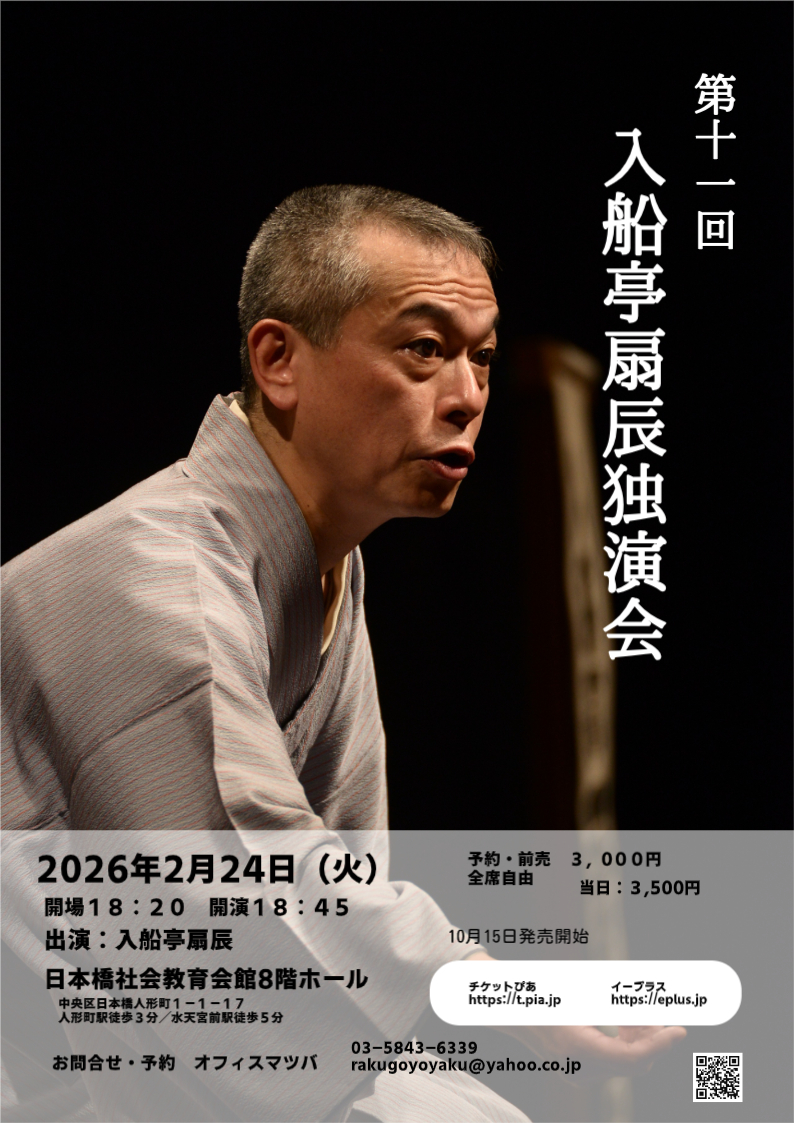 第十一回 入船亭扇辰独演会 日時:2026年2月24日(火)開場18:20、開演18:45 会場:日本橋社会教育会館8Fホール 料金:前売予約3,000円、当日3,500円、全席自由 出演:入船亭扇辰 問合予約:03ー5843ー6339 オフィスマツバ rakugoyoyaku@yahoo.co.jp 前売:10月15日発売開始、チケットぴあ、イープラス |