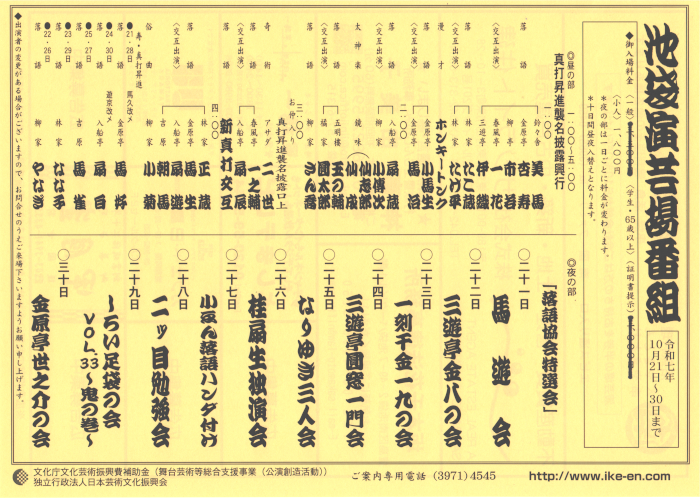 下席 池袋演芸場 昼の部 ※詳細は 池袋演芸場HP、 落語協会HPを ご参照ください |
